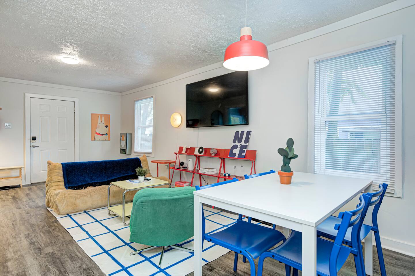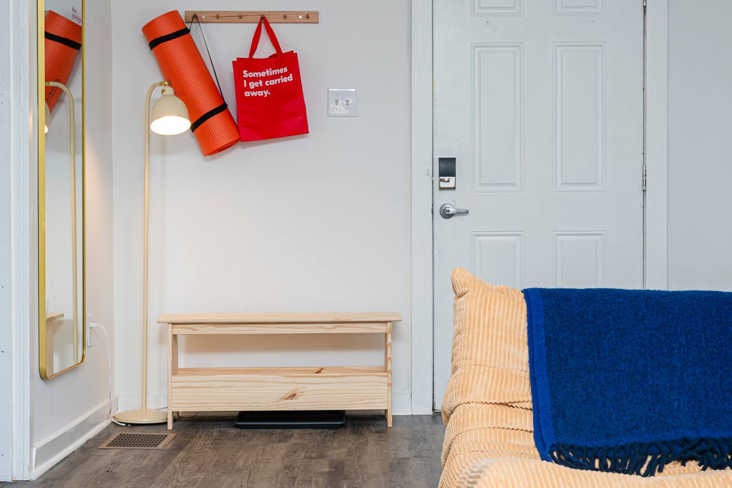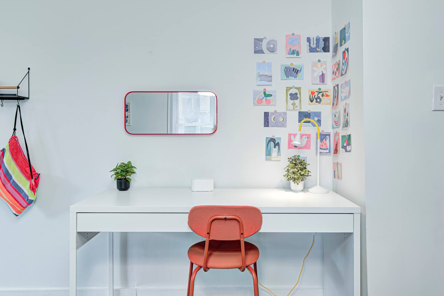 π‘ Living Room: The living room is spacious and thoughtfully decorated with bursts of bold colors, a comfy couch, and a large smart TV for movie nights or relaxing after a day in the city. There is also a dedicated workspace with a desk and lamp, ideal for remote work.
