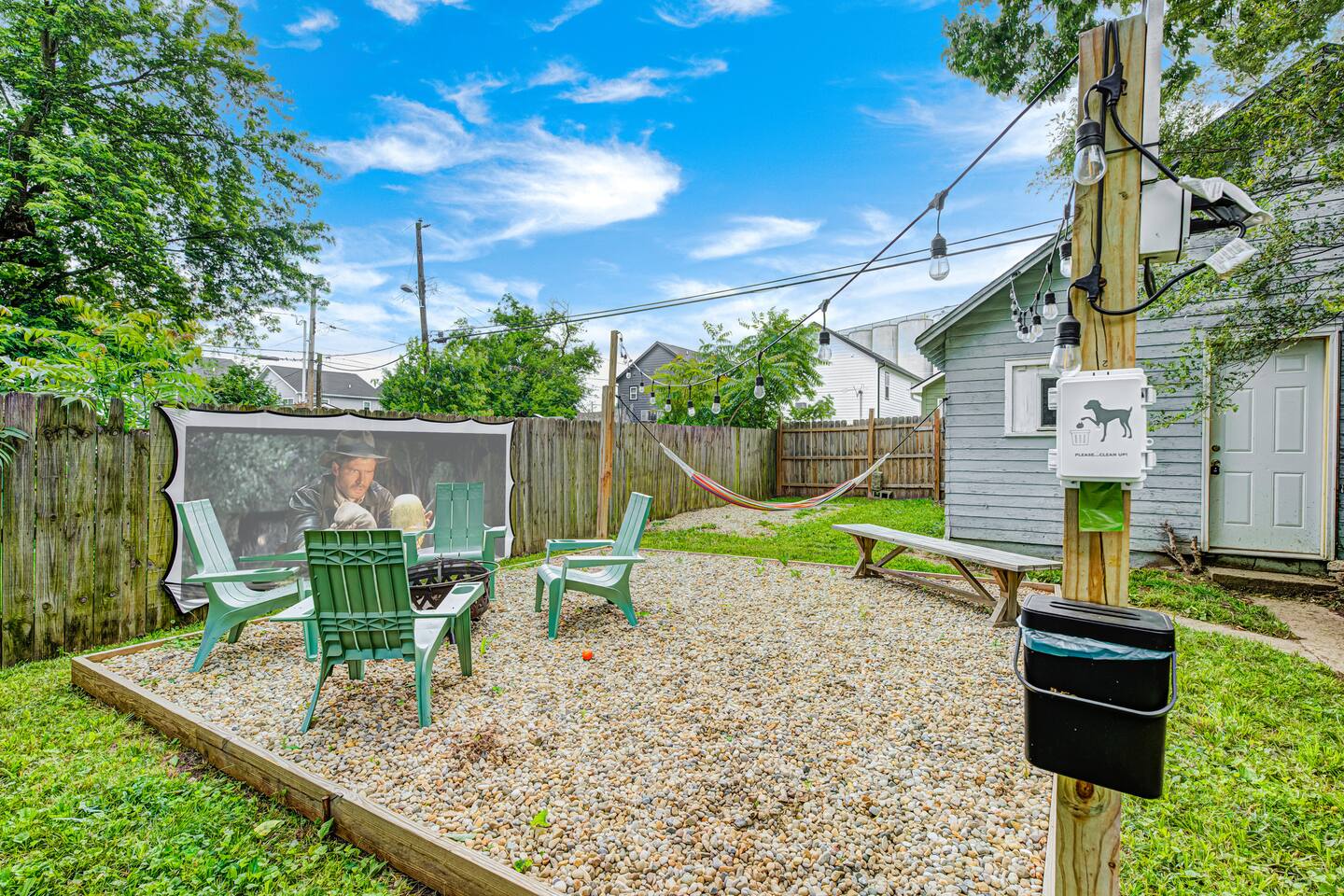 π£ Outdoor Space: Step out into a fully-fenced backyard that's designed for fun and relaxation. Roast s'mores at the firepit, unwind in the hammock, or enjoy a movie night under the stars with the outdoor projector and screen. String lights set the perfect evening mood, and a doggy station makes this space just as welcoming for your furry friends. There is also a sunroom-style front porch with table and chairs making for the perfect place to sip your morning coffee or watch an Indy thunderstorm roll by.